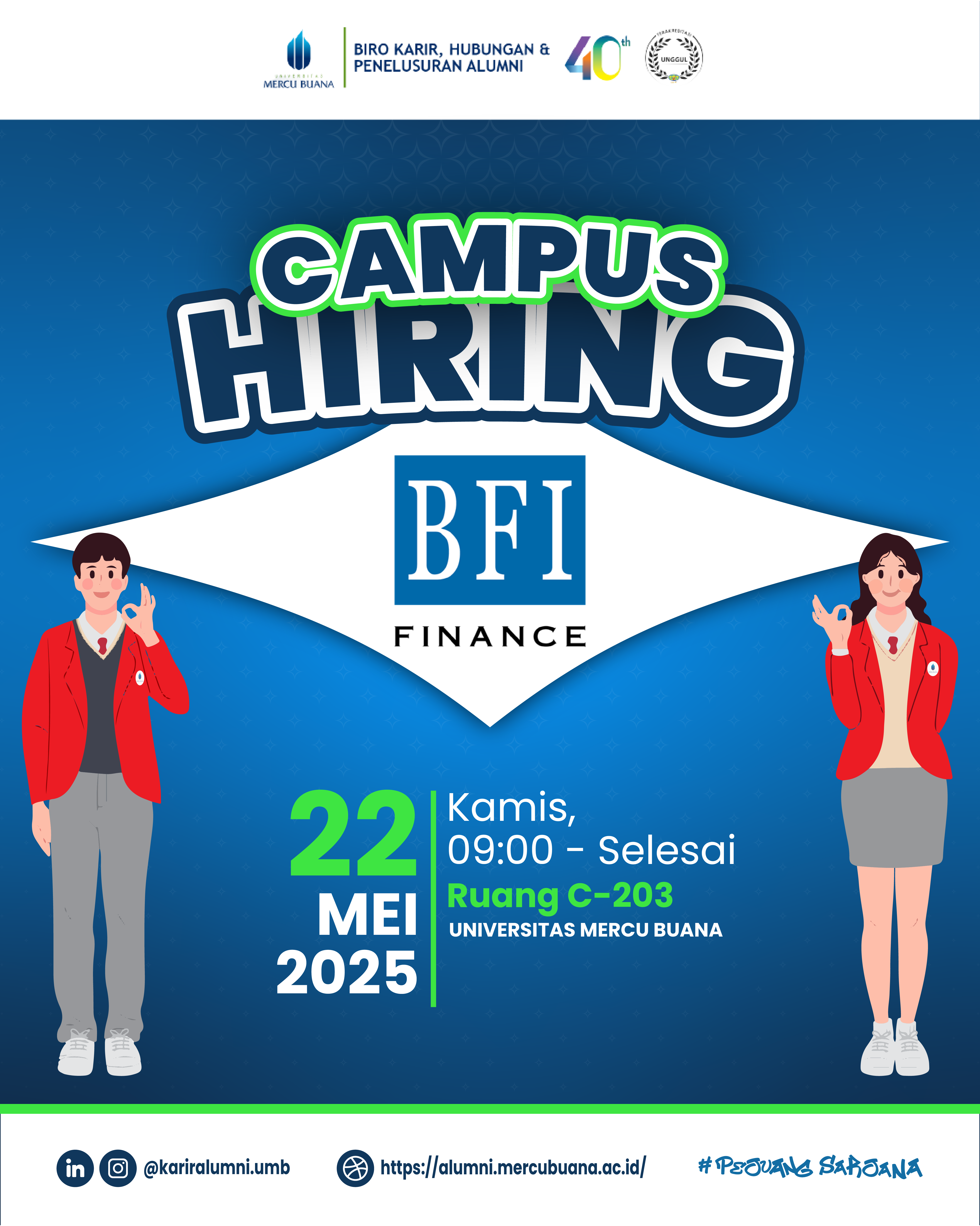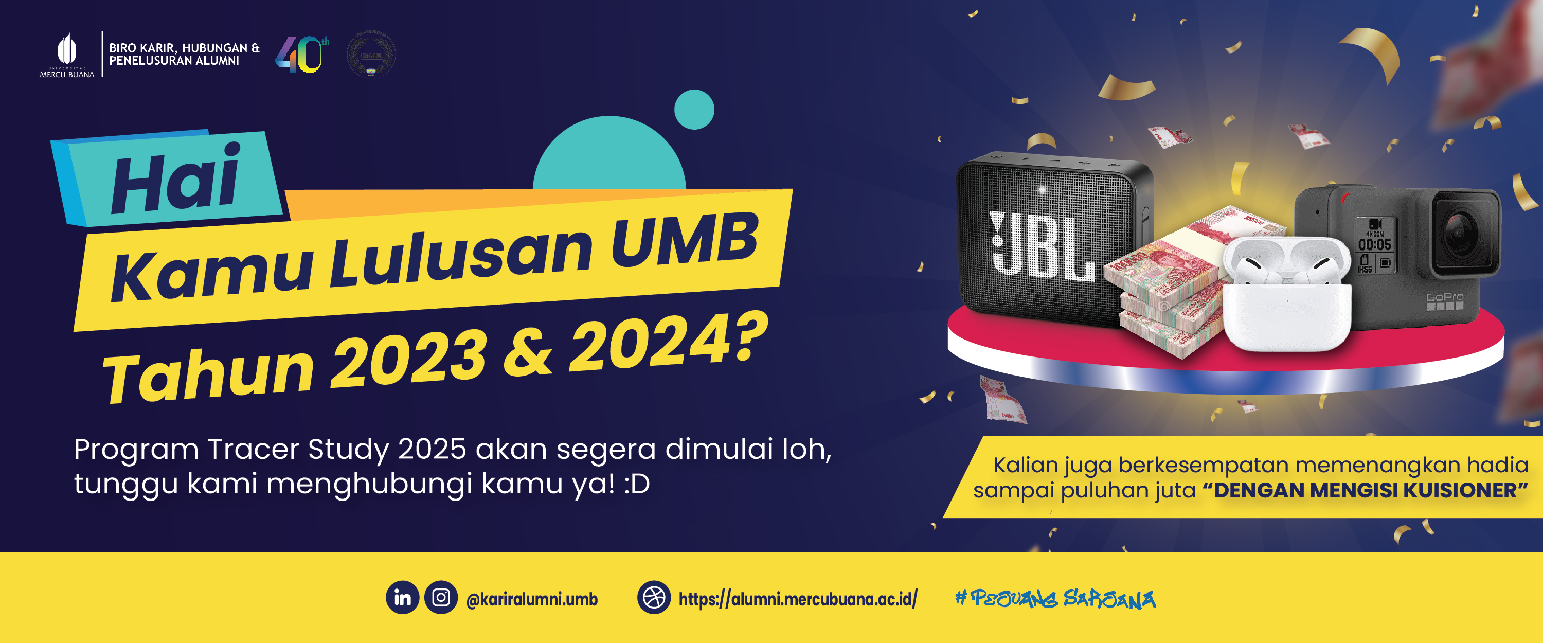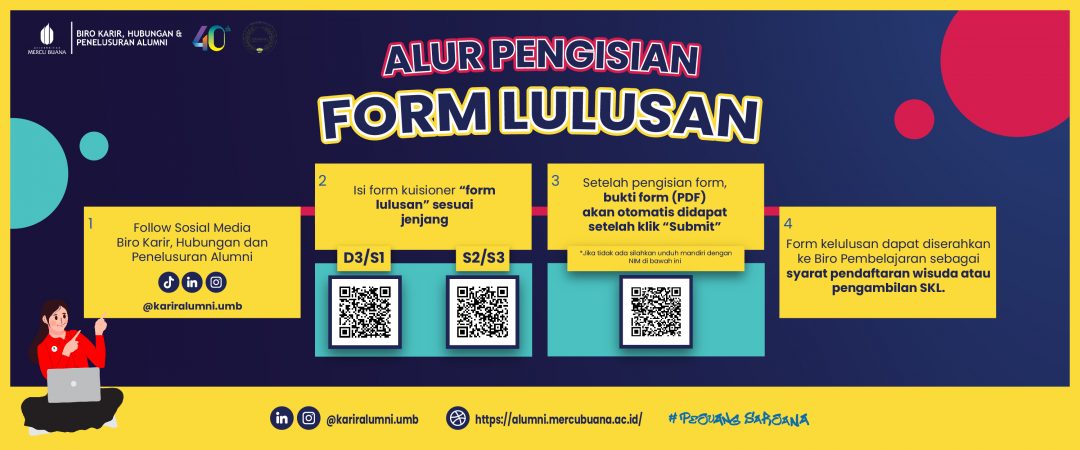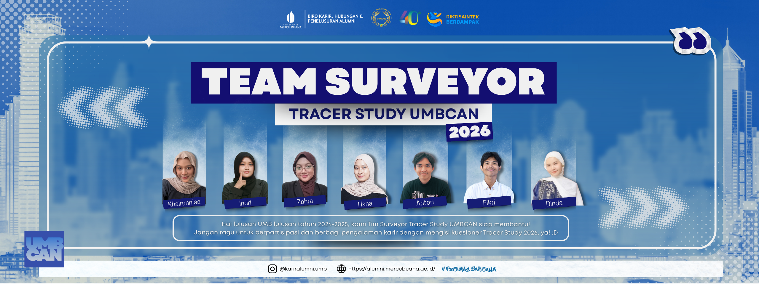 Oleh karena itu, segera melalui laman ini UMB Biro Karir, Hubungan, dan Penelusuran Alumni akan meluncurkan Tracer Study bagi alumni UMB, dan kami mohon kesediaan alumni UMB yang kami hormati untuk mengisi kuesioner Tracer Study. Besar harapan kami agar alumni bekerja sama dalam pengisian kuesioner tersebut untuk kemajuan UMB dan alumni. Untuk tahun ini, kami akan memulai Tracer Study dari alumni UMB yang lulus di tahun 2025.