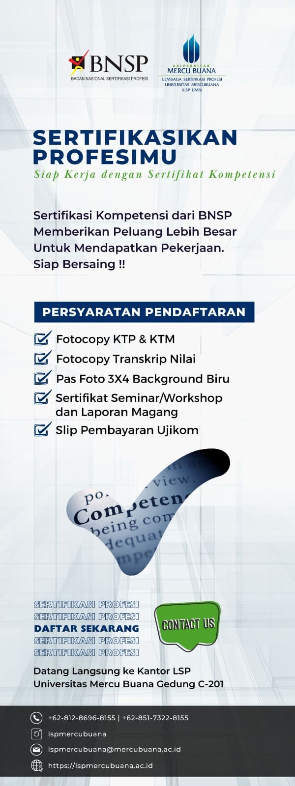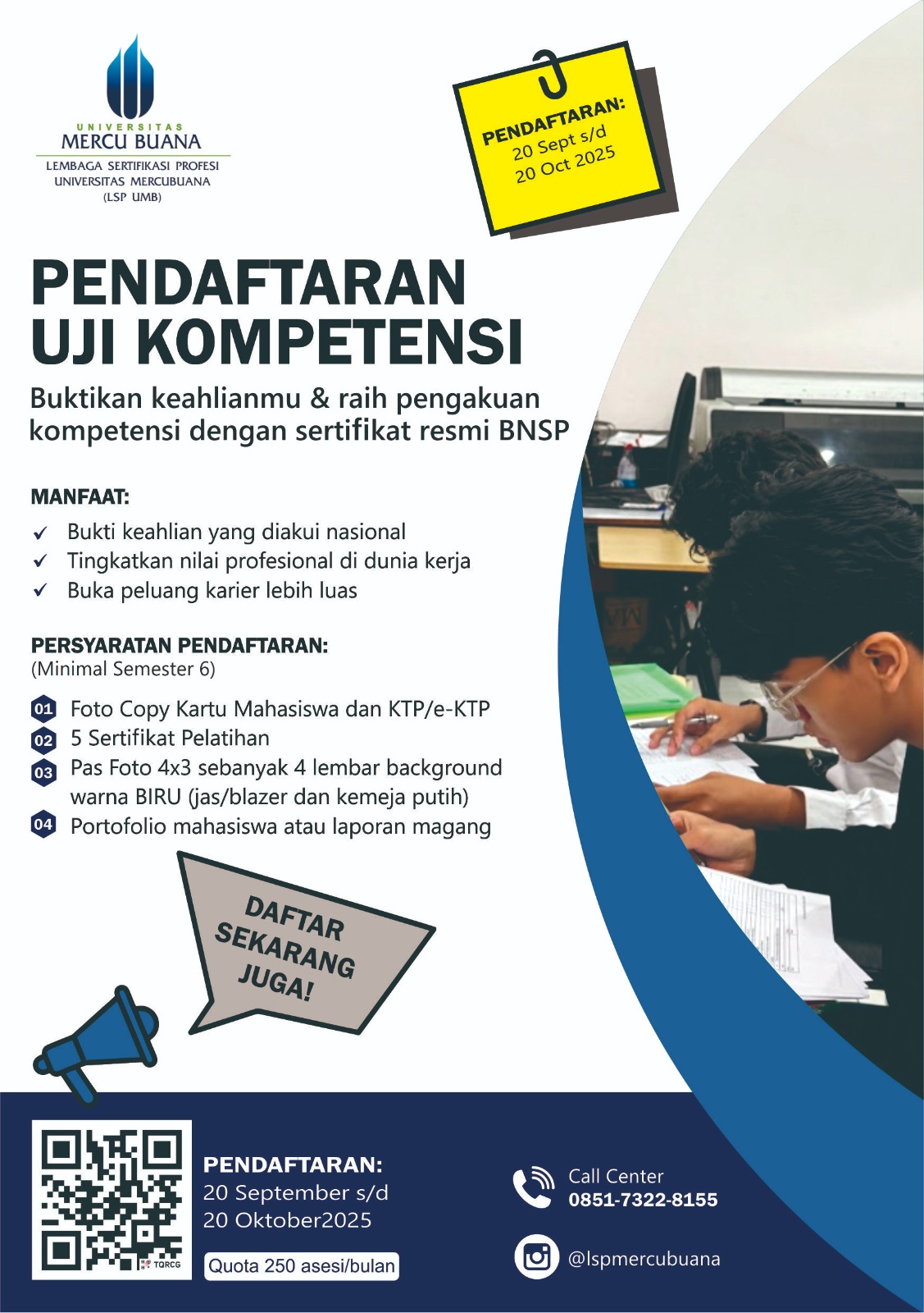 Dengan program sertifikasi yang terus berkembang dan ditingkatkan, Universitas Mercu Buana tidak hanya berfokus pada akademik, tetapi juga pada kesiapan mahasiswa untuk memasuki dunia profesional dengan keterampilan yang relevan dan dibutuhkan industri.