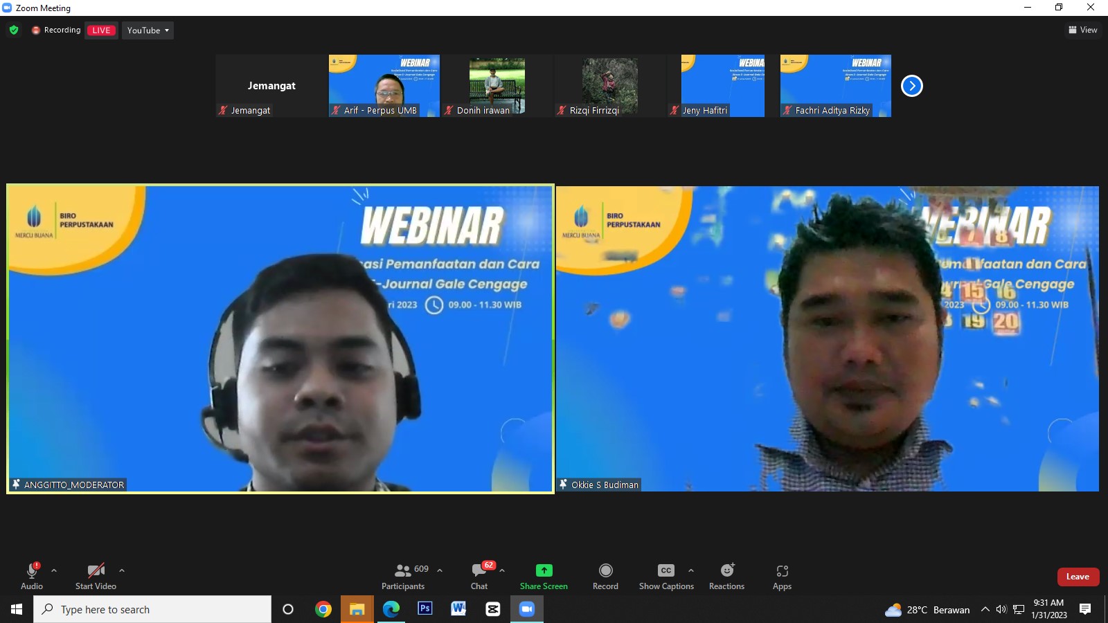 Webinar Sosialisasi Pemanfaatan dan Cara Akses E-Journal Gale Cengage diselenggarakan pada hari Selasa, 31 Januari 2023 secara online/daring melalui Zoom Meeting. Webinar di ikuti 873 peserta yang hadir terdiri mahasiswa dan dosen civitas UMB yang berasal dari seluruh kampus baik di pusat maupun dari kampus cabang Universitas Mercu Buana. E-Journal Gale Cengage merupakan database jurnal online yang berisi berbagai bidang ilmu. Perpustakaan UMB melanggan 3 bidang ilmu di antaranya : ekonomi, sosial humaniora dan teknik dengan total jumlah jurnal yang bisa diakses 1.901 judul jurnal fulltext. E-Journal Gale Cengage merupakan koleksi digital yang dapat diakses secara online oleh pengguna baik di dalam maupun di luar lingkungan kampus.