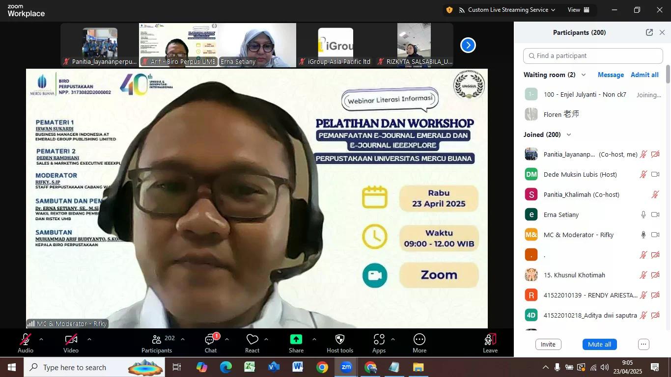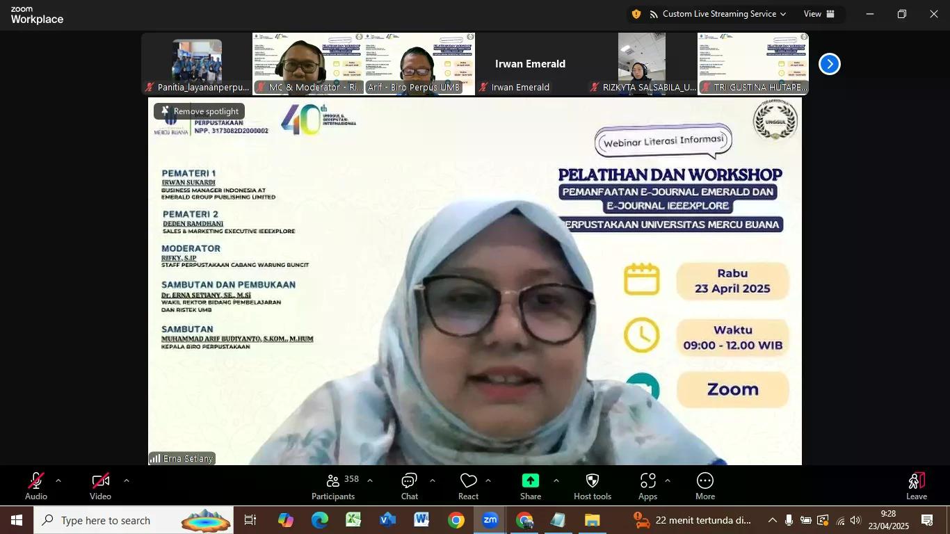 Perpustakaan Universitas Mercu Buana (UMB) kembali menggelar kegiatan webinar literasi informasi sebagai bagian dari upaya peningkatan literasi digital dan akademik di kalangan sivitas akademika pada hari Rabu, 23 April 2025. Kegiatan yang diselenggarakan kali ini mengusung tema “Pelatihan dan Workshop Pemanfaatan E-Journal Emerald dan E-Journal IEEEXplore Perpustakaan UMB” dan berlangsung secara daring melalui platform Zoom Meeting. Dengan adanya webinar kali ini diharapkan mahasiswa mengetahui pemanfaatan e-resources, cara akses download e-journal Emerald dan e-journal IEEEXplore dan untuk mendorong pengguna perpustakaan khususnya mahasiswa, dosen dan civitas akademik agar menjadikan perpustakaan sebagai tempat untuk mencari rujukan referensi penelitian Perpustakaan UMB. Webinar ini merupakan sesi keempat dalam rangkaian program literasi informasi yang diselenggarakan pada tahun akademik 2024/2025. Antusiasme peserta terlihat dari jumlah kehadiran yang mencapai 539 orang, terdiri dari 529 mahasiswa serta 10 dosen dan tenaga kependidikan. Peserta berasal dari tiga kampus utama UMB, yaitu Kampus Meruya, Menteng, dan Warung Buncit.
