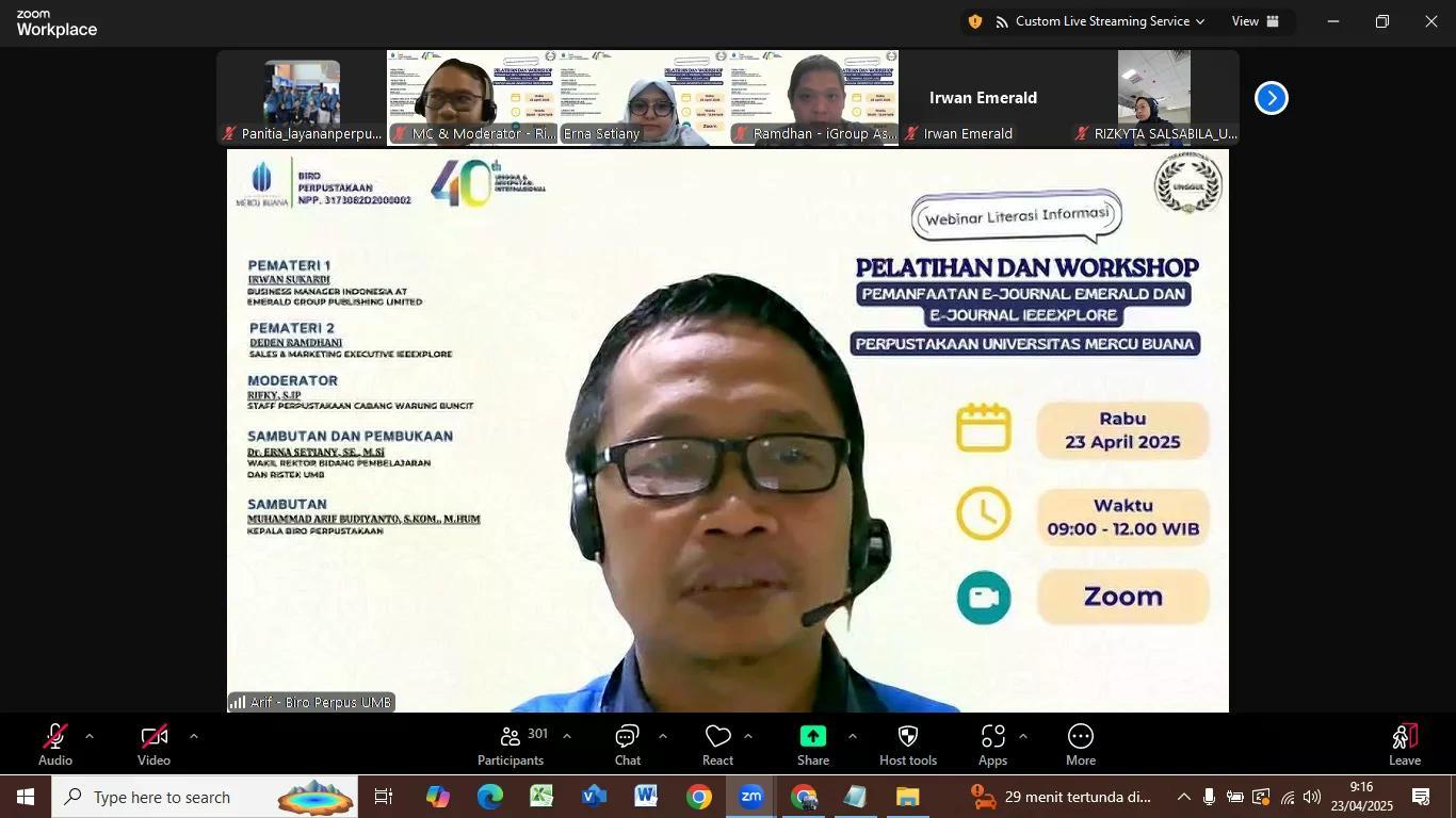 Dalam sambutan dan laporan Kepala Biro Perpustakaan UMB, Muhammad Arif Budiyanto, M.Hum., mengatakan ”Kegiatan hari ini adalah salah satu kegiatan rutin di perpustakaan yang berkaitan dengan program literasi informasi kepada seluruh civitas akademika UMB yaitu Pelatihan dan Workshop Pemanfaatan E-Journal Emerald dan E-Journal IEEEXplore Perpustakaan UMB, kegiatan webinar ini sudah dilakukan yang keempat kalinya diselenggarakan pada tahun akademik 2024/2025 dan dilakukan secara online atau daring agar dapat dijangkau oleh peserta yang lebih banyak dan luas yang berada di kampus mercu buana baik dari kampus meruya maupun dari kampus -kampus cabang lainnya. Selanjutnya, nanti kami akan menyelenggarakan kegiatan literasi informasi yang kelima insyaallah pada bulan Juni 2025 dengan tema pemanfaatan repository dan layanan turnitin Perpustakaan UMB. Webinar ini bertujuan: untuk mengenal e-resources perpustakaan khususnya e-journal Emerald dan e-journal IEEEXplore, cara mengakses dan mengunduh e-journal emerald dan e-journal ieeexplore. tambahan informasi bahwa perpustakaan memiliki ribuan koleksi artikel yang tersedia dan dilanggan oleh perpustakaan umb, Memberikan rujukan konten ilmiah untuk meningkatkan kualitas penelitian dan tugas akhir sivitas akademika UMB, ujar Arif.