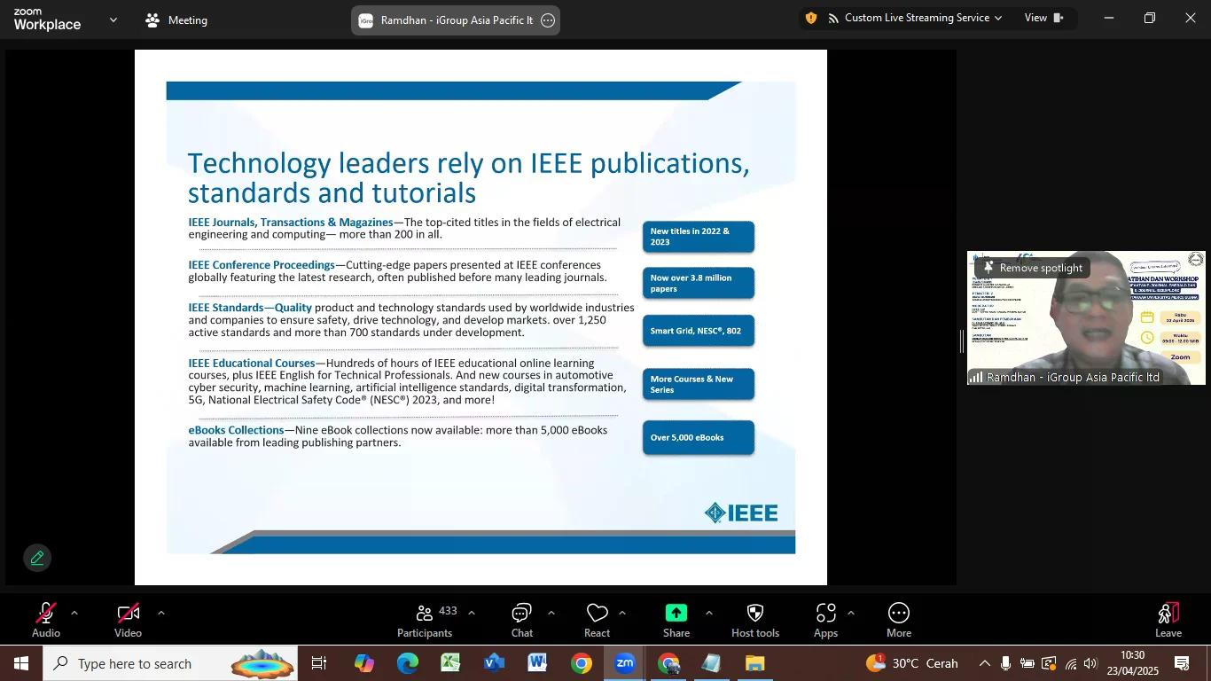Untuk pemaparan materi kedua dari webinar kali ini disampaikan oleh Bapak Deden Ramdhani, yang menjelaskan bagaimana cara akses dan download tentang e-journal IEEEXplore, cara pembuatan akun e-journal emerald, penelusuran koleksi e-journal IEEEXplore, penelusuran proyek artikel e-journal IEEEXplore dan menjelaskan terkait filtur-filtur yang ada di e-journal IEEEXplore. selain menjelaskan secara detail terkait materi yang disampaikan, bapak deden ramdhani juga menjawab beberapa pertanayaan seputar e-journal IEEEXplore seperti cara mendaftarkan artikel yang akan di publish di e-journal IEEEXplore, dan berapa lama kita menunggu hasil submit yang sudah di publish di e-journal IEEEXplore.
