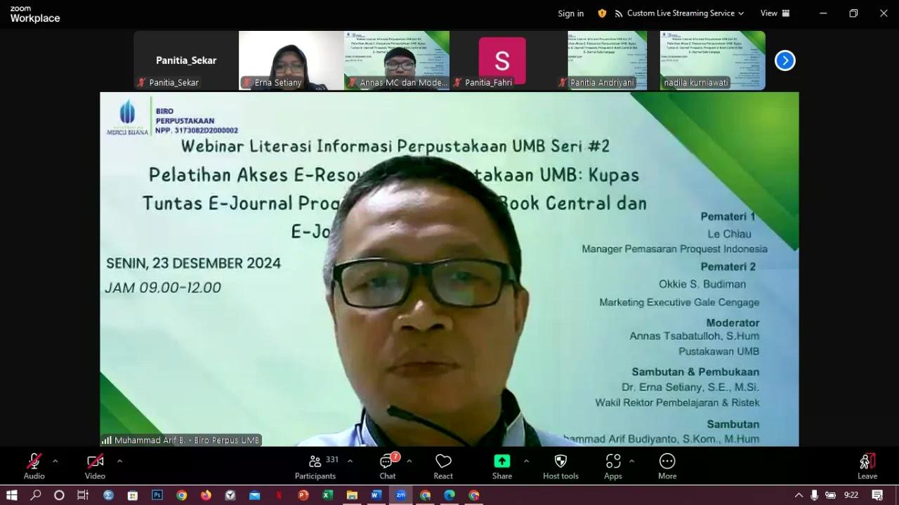 Dalam sambutannya Kepala Perpustakaan UMB Muhammad Arif Budiyanto, M.Hum menyampaikan, “Pada webinar yang bertema Pelatihan Akses E-Resources Perpustakaan UMB: Kupas Tuntas E-Journal Proquest, Proquest E-Book Central dan E-Journal Gale Cengage ini bertujuan untuk menyampaikan pengetahuan dasar cara mengakses, mengunduh konten-konten e-resources dan langsung mempraktekkan serta berlatih bagaimana mengakses dengan mudah dan memanfaatkan secara tepat dan maksimal semua konten yang ada di E-journal atau E-book yang dilanggan oleh perpustakaan. Kemudian untuk meningkatkan jumlah akses, baik akses unduh, melihat dan memanfaatkan E-journal sehingga jika aksesnya masih tinggi, maka e-journal akan terus dilanggan oleh Universitas Mercu Buana. Oleh karena itu kami mohon partisipasi civitas akademika untuk memanfaatkan fasilitas ini.
