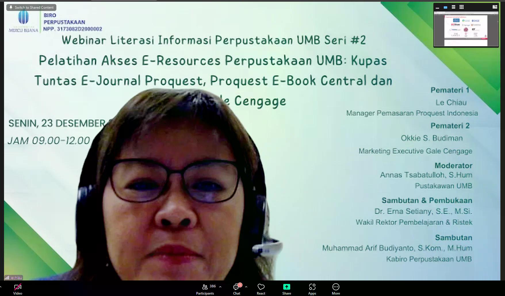 Kegiatan webinar dilanjutkan dengan pemaparan materi webinar pertama oleh Ie Chiau yang merupakan perwakilan dari Proquest Indonesia yang menyampaikan bagaimana cara akses dan download E-Journal dan E-Book Proquest.