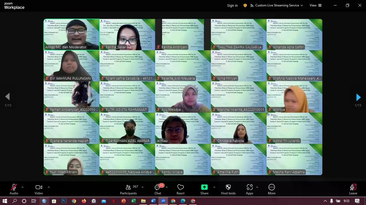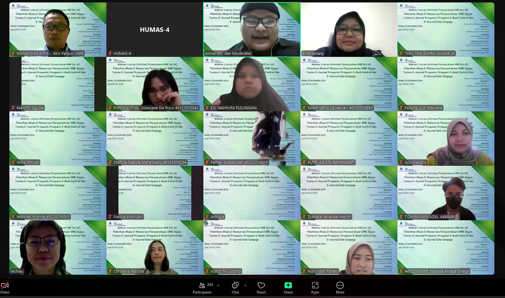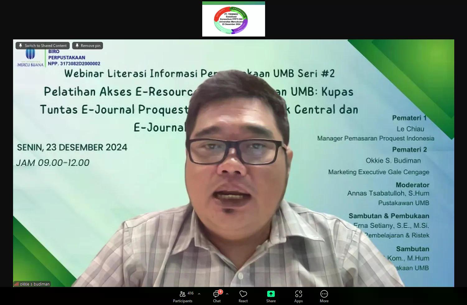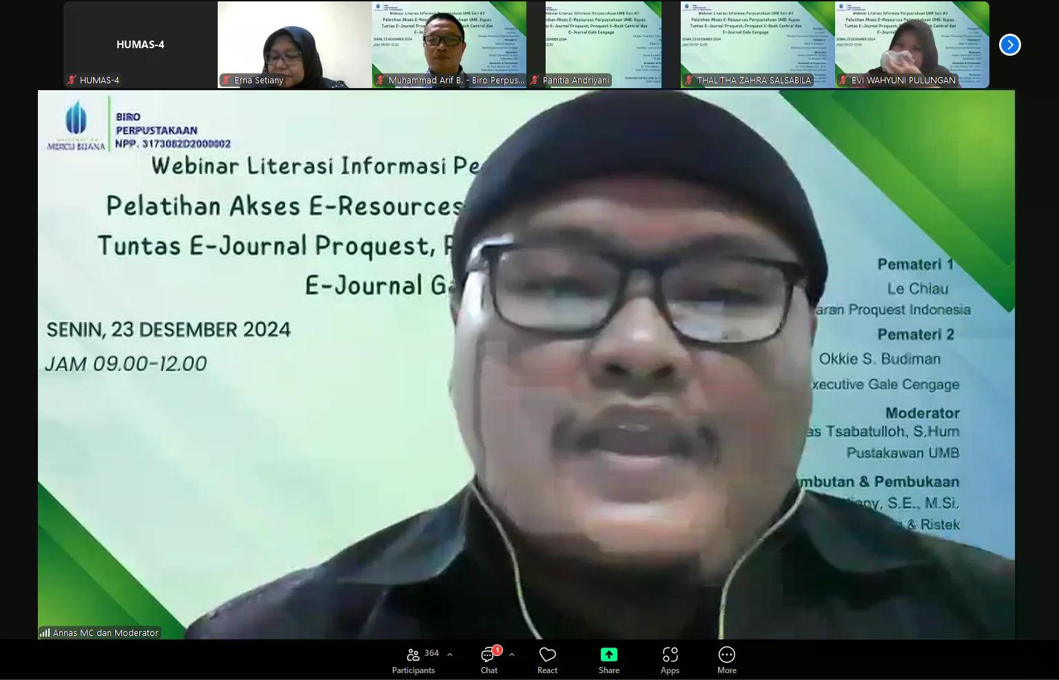Perpustakaan Universitas Mercu Buana (UMB) mengadakan kegiatan webinar literasi informasi yang kedua kalinya pada tahun akademik 2024/2025 yaitu pada hari Senin, 23 Desember 2024. Adapun tema yang diusung pada webinar kali ini ialah Pelatihan Akses E-Resources Perpustakaan UMB: "Kupas Tuntas E-Journal Proquest, Proquest E-Book Central dan E-Journal Gale Cengage". Kegiatan ini diselenggarakan secara online melalui link zoom meeting dan live streaming Youtube Perpustakaan UMB. Peserta yang mengikuti dan mengisi daftar hadir pada webinar ini sebanyak 504 peserta, baik dari kalangan dosen maupun mahasiswa.