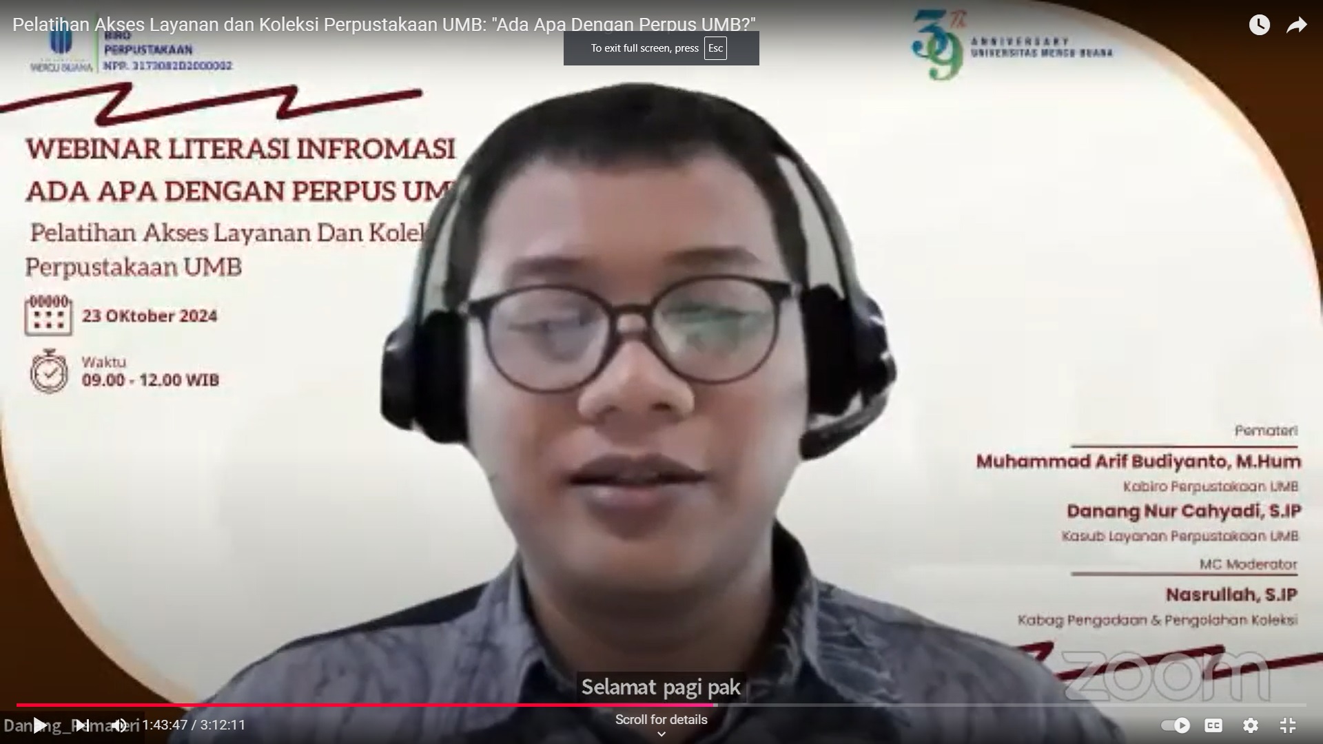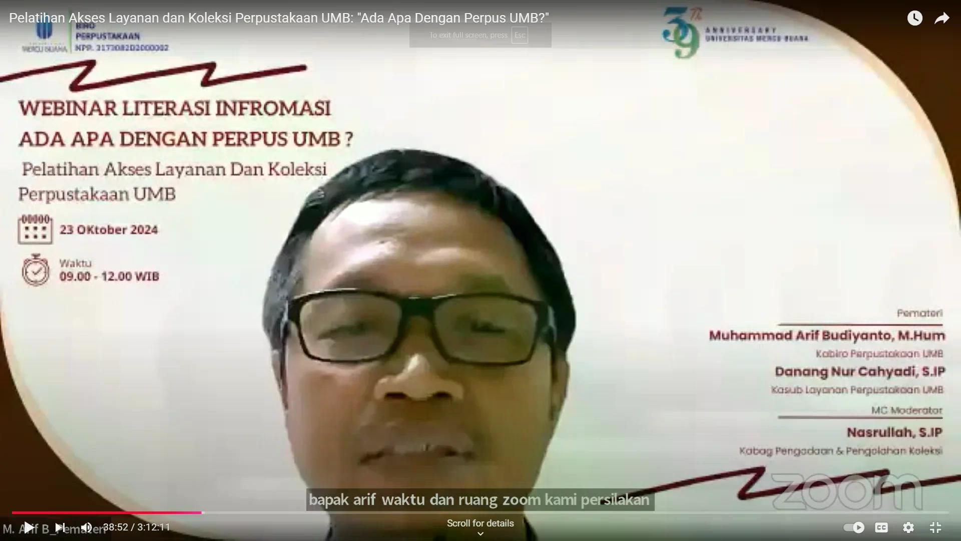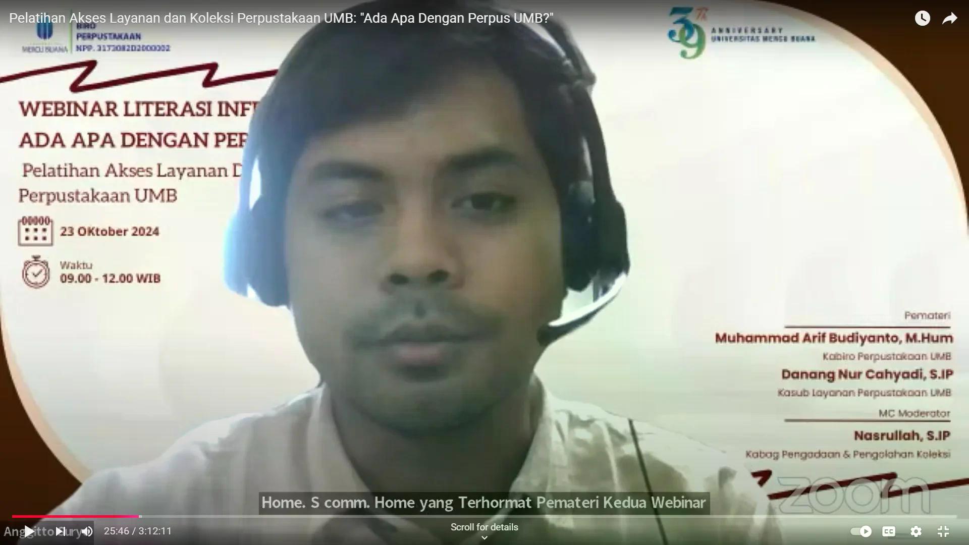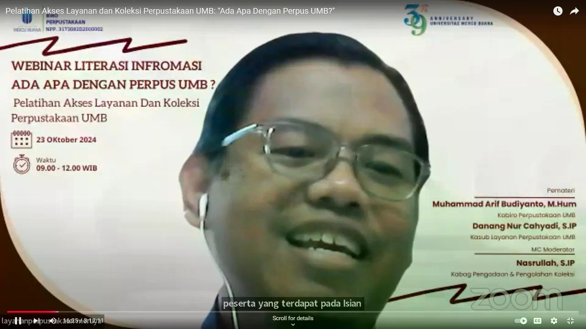 Pada Webinar kali ini menampilkan pemateri pertama Muhammad Arif Budiyanto, S.Kom, M.Hum, Kepala Biro Perpustakaan UMB yang memaparkan cara akses koleksi dan fasilitas Perpustakaan Universitas Mercu Buana dan Tujuan webinar kali ini adalah memperkenalkan perpustakaan Mercu Buana khususnya kepada mahasiswa baru, memperkenalkan layanan dan jasa kepada pengguna agar pengguna mendapatkan informasi yang jelas dan relevan, memperkenalkan koleksi yang ada di perpustakaan dan memberikan edukasi kepada mahasiswa tentang layanan dan koleksi di perpustakaan sehingga mereka dapat memaksimalkan fasilitas yang ada.