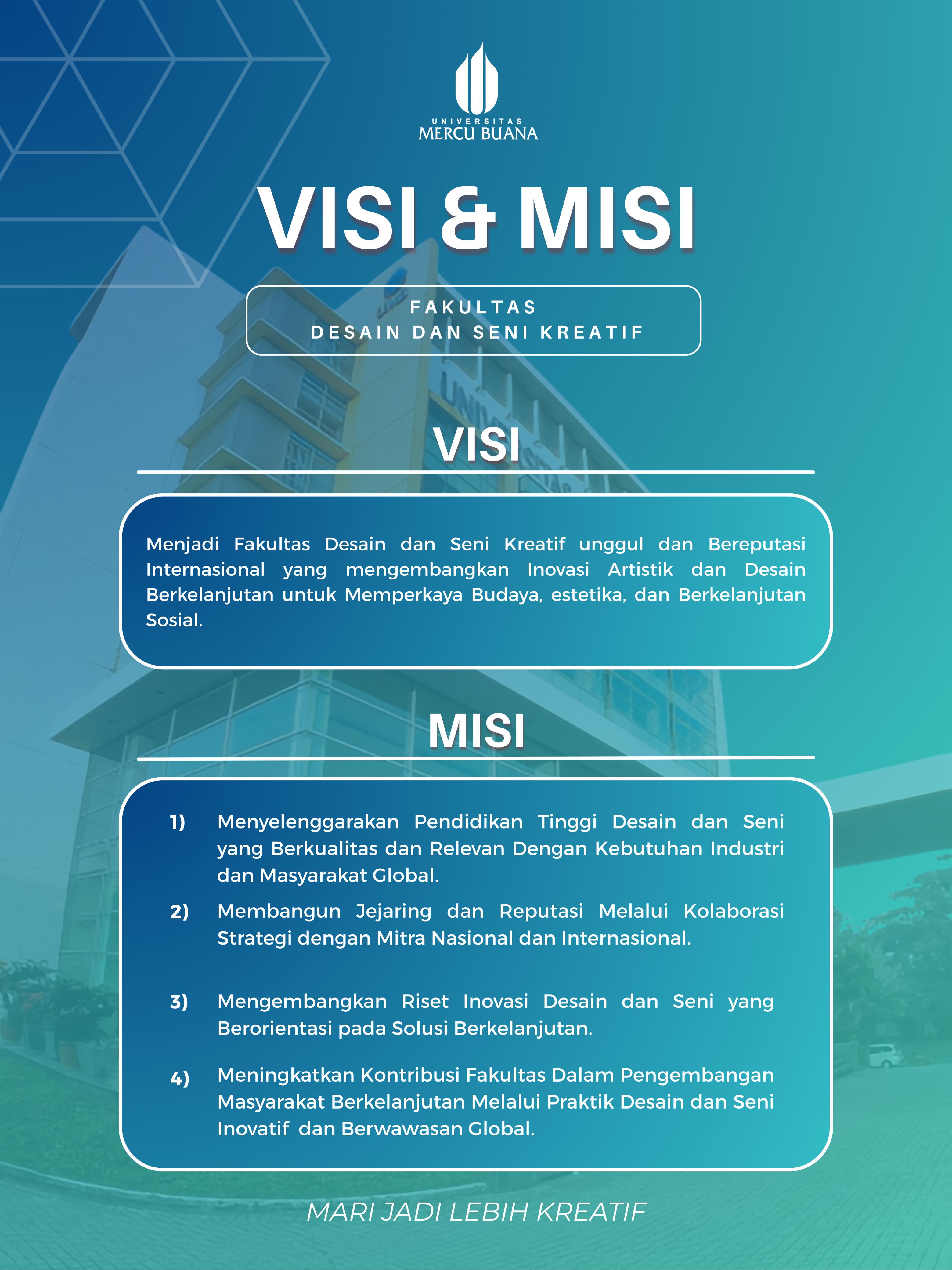 Fakultas Desain dan Seni Kreatif Universitas Mercu Buana merupakan sebuah kolaborasi pemikiran kreatif dan hasil karya terpadu menjadi Desain Produk, Desain Interior dan Desain Komunikasi Visual. Fakultas Desain dan Seni Kreatif menyiapkan mahasiswanya untuk membuka mata pada dunia untuk dapat mengerti baik yang non-literasi, imajinasi, dapat berfikir secara terbuka dalam menghayati pemikiran desain dan seni, kami bukan hanya menyediakan kuliah di dalam kelas, namun mendorong mahasiswa untuk lebih mengembangkan secara terknik, teori, mengadakan pameran, analisis kritik baik seni dan desain dan proses kreatif.